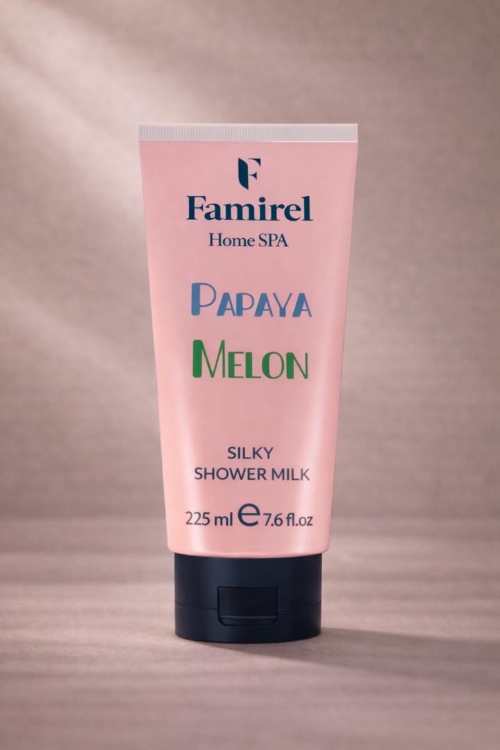 חלב רחצה מפנק לגוף בניחוח פפאיה ומלון לניקוי עדין ולתחושת רעננות FAMIREL