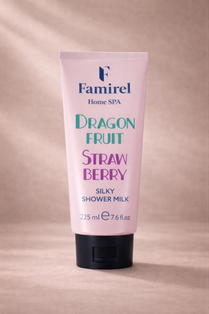 חלב רחצה מפנק לגוף בניחוח פיטאיה ותות שדה לניקוי עדין ולתחושת רעננות FAMIREL