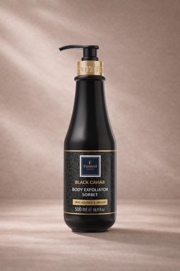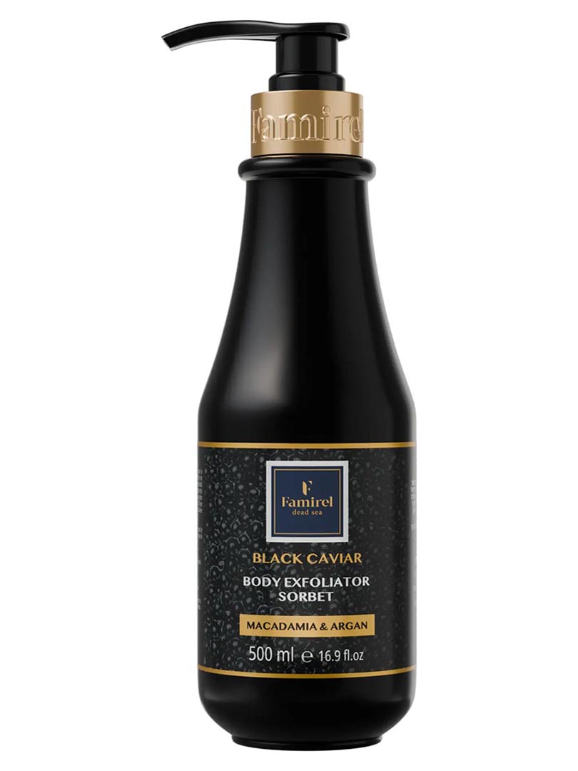 ג׳ל סורבה פילינג למקלחת עם תמצית קוויאר שחור שמן מקדמיה ושמן ארגן FAMIREL
